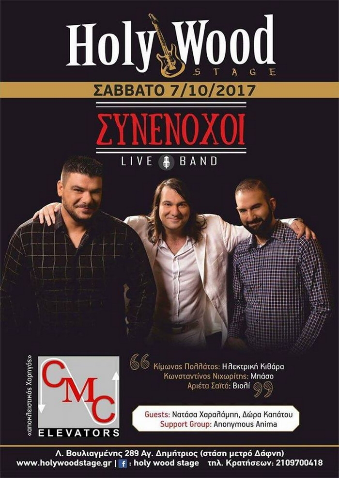 ΟΙ ΣΥΝΕΝΟΧΟΙ Live Band ανοίγουν την αυλαία της φετινής σεζόν στο HolyWood Stage...!Με παρουσιάση του 2ου καινούριου τραγουδιού τους (από την Final Touch ) και με ανανεωμένο πρόγραμμα!Μαζί τους οι μόνιμοι συνεργάτες - συνένοχοιΚίμωνας Πολλάτος:ηλεκτρική κιθάρα Αριέτα Σαϊτά :βιολί Κώστας Νιχωρίτης :μπάσο Guests Νατάσα Χαραλάμπη-Δώρα ΚαπάτουSupport group :Anonymous AnimaΣας περιμένουμε όλους για να γίνουμε Συνένοχοι...Καλή αντάμωση! Ημέρα: Σάββατο 7 Οκτωβρίου Ώρα έναρξης: 22.30 . Προπώληση Εισιτήριων 8 € με δωρεάν ποτήρι μπύρα […]