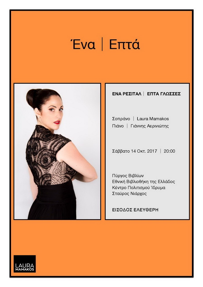 H Σοπράνο Laura Mamakos παρουσιάζει το Ένα⏐Επτά, ένα ρεσιτάλ σε επτά γλώσσες. Ερμηνεύει lieder και άριες των Bach, Schumann, Gounod, Cilea, Ginastera κ.α. Συνοδεία στο πιάνο, Γιάννης Αερινιώτης. Ειδική προβολή βίντεο (video mapping), Κωσταντίνος Πιλάβιος. Σἀββατο, 14 Οκτωβρίου 2017, 20:00. Είσοδος Ελεύθερη. Πύργος Βιβλίων, Εθνική Βιβλιοθήκη της Ελλάδος Κέντρο Πολιτισμού Ίδρυμα Σταύρος Νιάρχος ΒΙΟΓΡΑΦΙΚΑ: Η ΣΟΠΡΑΝΟ LAURA MAMAKOS Γεννήθηκε στο San Francisco (Η.Π.Α.). Έχει εμφανιστεί σε όπερες στις Η.Π.Α., […]