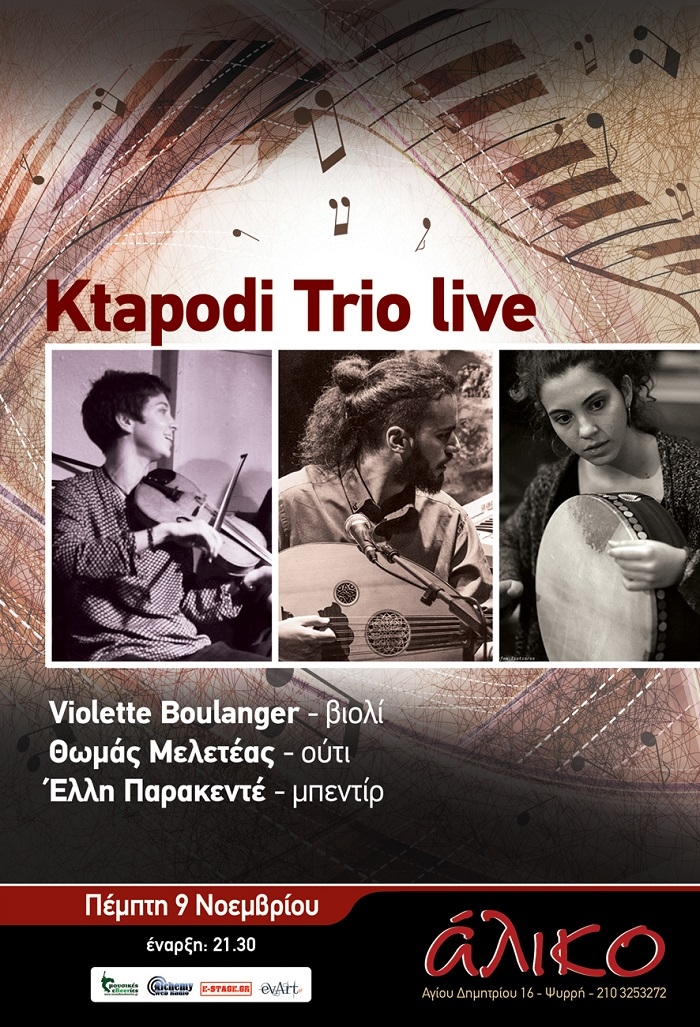 Πέμπτη 9 Νοεμβρίου | 21.30 Ktapodi trio Το σχήμα θα ερμηνεύσει πρωτότυπες συνθέσεις επηρεασμένες από την μουσική παράδοση της ανατολικής Μεσογείου καθώς και παραδοσιακές μελωδίες και σκοπούς από τα παράλια της Μικράς Ασίας, της Θράκης και άλλων περιοχών του ελλαδικού χώρου.Violette Boulanger: βιολίΘωμάς Μελετέας: ούτιΈλλη Παρακεντέ: μπεντίρ Τιμή εισιτηρίου 3 € ΆλικοΑγίου Δημητρίου 16Ψυρρή2103253272www.aliko-cafe.gr alikocafe@gmail.com facebook.com/alikocafe