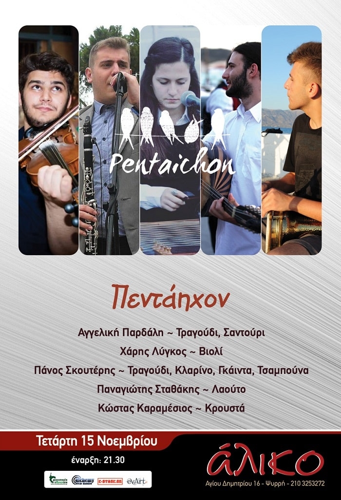 Τετάρτη 15 Νοεμβρίου | 21.30 Πεντάηχον Το Πεντάηχον για πρώτη φορά στο Άλικο σε ένα μουσικό οδοιπορικό με οδηγό το συναίσθημα και γνώμονα τις ρίζες μας.Μοιρολόγια, αμανέδες, χαβάδια και αηδονίσματα συνθέτουν ένα παλιακό σκηνικό στην καρδιά της Αθήνας. Αγγελική Παρδάλη: τραγούδι, σαντούριΧάρης Λύγκος: βιολίΠάνος Σκουτέρης: τραγούδι, κλαρίνο, γκάιντα, τσαμπούναΠαναγιώτης Σταθάκης ~ ΛαούτοΚώστας Καραμέσιος: κρουστά Τιμή εισιτηρίου 3 € ΆλικοΑγίου Δημητρίου 16Ψυρρή2103253272www.aliko-cafe.gr alikocafe@gmail.com facebook.com/alikocafe