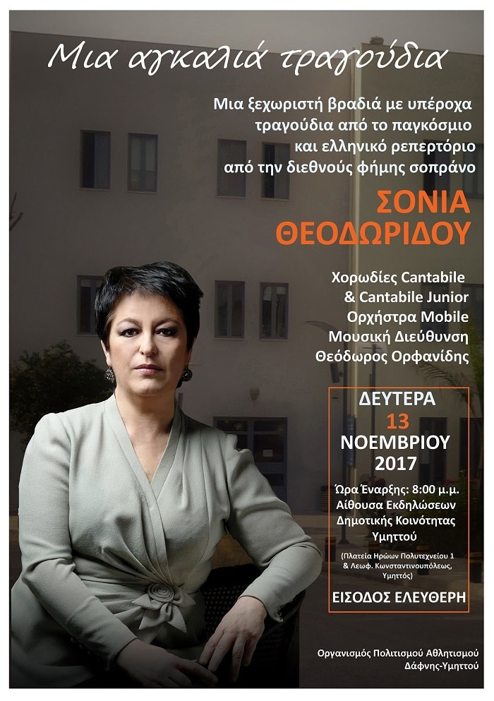 «Μια αγκαλιά τραγούδια» ΜΕ ΤΗΝ ΔΙΕΘΝΟΥΣ ΦΗΜΗΣ ΣΟΠΡΑΝΟΣΟΝΙΑ ΘΕΟΔΩΡΙΔΟΥΣε μια μοναδική συναυλία Μια ξεχωριστή βραδιά με υπέροχα τραγούδια από το παγκόσμιο και ελληνικό ρεπερτόριο. Αγαπημένες μελωδίες από τον Μίκη Θεοδωράκη και τον Lucio Dalla, τον Μάνο Χατζιδάκι και τον Ennio Morricone. Μαζί της οι Χορωδίες Cantabile και Cantabile Junior και η Ορχήστρα Mobile, υπό την Μουσική Διεύθυνση του Θεόδωρου Ορφανίδη. Δευτέρα 13 Νοεμβρίου 2017 στις 8:00 μ.μ.Αίθουσα Εκδηλώσεων Δημοτικής Κοινότητας Υμηττού(Πλατεία Ηρώων […]