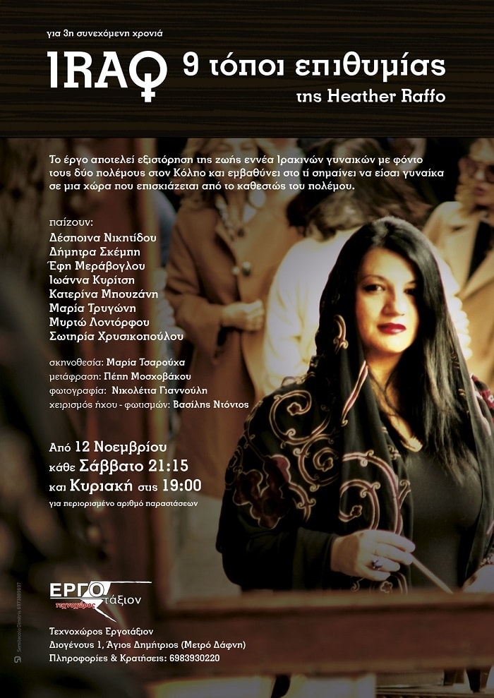 «ΙRAQ - 9 τόποι επιθυμίας»της Heather Raffo Από 12 Νοεμβρίου στον Τεχνοχώρο Εργοτάξιον Το έργο αποτελεί εξιστόρηση της ζωής εννέα Ιρακινών γυναικών, με φόντο τους δύο πολέμους στον Κόλπο και εμβαθύνει στο τί σημαίνει να είσαι γυναίκα, σε μια χώρα που επισκιάζεται από το καθεστώς του πολέμου. Είναι ένα υπόδειγμα γραφής, που το περιοδικό «New Yorker», το περιέγραψε ως «ένα παράδειγμα πως η τέχνη είναι δυνατόν να ανοικοδομήσει τον κόσμο». […]