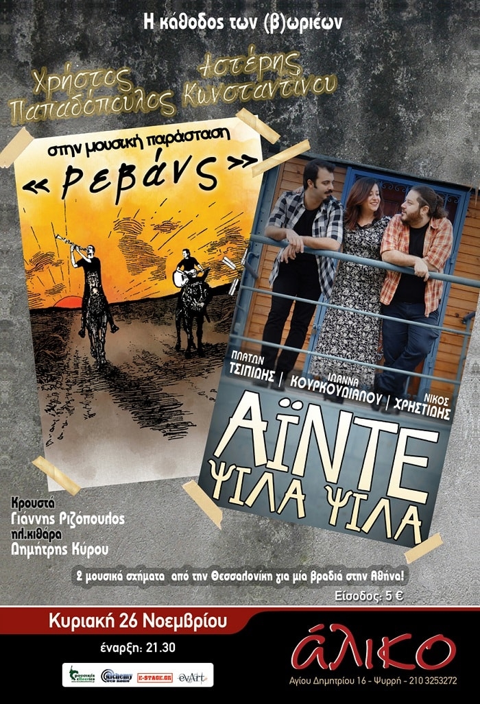 Κυριακή 26 Νοεμβρίου | 21.30 Η κάθοδος των (Β)ωριέων Δύο μουσικά σχήματα από τη Θεσσαλονίκη μαζί για μια βραδιά στο Άλικο! Οι Άιντε ψιλά ψιλά συνεχίζουν τη μουσική διαδρομή τους, γύρω από ένα ευρύ φάσμα ακουσμάτων με βασικό άξονα το έντεχνο–εναλλακτικό τραγούδι αλλά και με αναφορές στην καλή λαϊκή και ρεμπέτικη μουσική. Οι Ρεβάνς παρουσιάζουν την καινούρια τους επαγγελματική συνεργασία, η οποία κλείνει μέσα της χρόνια προσωπικής και […]