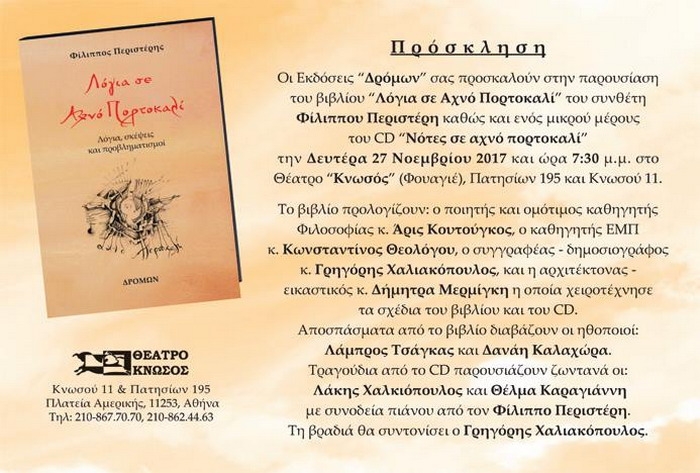 Tα Μάτια του Έρωτα *βασισμένο στο Όνειρο Καλοκαιρινής Νύχτας του Σαίξπηρ Skrow Theater Group 02.12.2017-01.04.2018 Είμαστε όλοι εν δυνάμει καλλιτέχνες. Τα όνειρά μας είναι οι ταινίες της ψυχής μας. Τέλεια σκηνοθετημένα και ερμηνευμένα από εμάς τους ίδιους. Στα «Μάτια του έρωτα» τίθενται ερωτήματα για τις βασικές έννοιες που πραγματεύεται το έργο, χωρίς να γυρεύουν μία εξαναγκαστική, τελειωτική και λογική απάντηση. Γιατί ο έρωτας και ο θάνατος είναι εκ γενετής […]