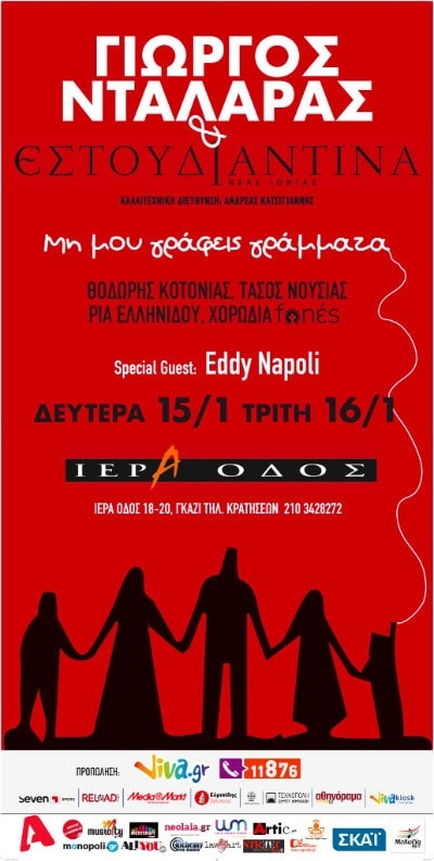 "ΜΗΝ ΜΟΥ ΓΡΑΦΕΙΣ ΓΡΑΜΜΑΤΑ" Special Guest: EDDY NAPOLIκαι ξεχωριστοί προσκεκλημένοι 15 και 16 Ιανουαρίου ΙΕΡΑ ΟΔΟΣ "Μην μου γράφεις γράμματα... γιατί γράμματα δεν ξέρω και με πιάνουν κλάματα...":Ένα συναρπαστικό μουσικό οδοιπορικό, μια μουσική παράσταση - ωδή στην ξενιτιά, στην μετανάστευση, αλλά και στο ταξίδι, στη ζωή, στη χαρά, στον έρωτα, με Ελληνικά τραγούδια και τραγούδια της Μεσογείου, παρουσιάζει ο Γιώργος Νταλάρας με την Εστουδιαντίνα στις 15 και 16 Ιανουαρίου στην Ιερά Οδό. Ξεχωριστός καλεσμένος ο Ιταλός Eddy Napoli, συνθέτης και […]