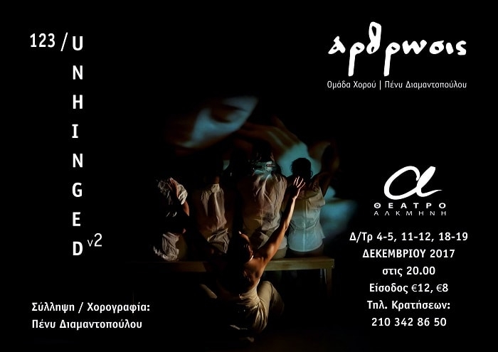 123 / UNHINGED v2 Οι δύο νέες χορογραφικές δουλειές της ομάδας Άρθρωσις - Πένυ ΔιαμαντοπούλουΣτο Θέατρο ΑλκμήνηΔευτέρα & Τρίτη 11-12, 18-19 Δεκεμβρίου 2017, στις 20.00 Σε σύλληψη και χορογραφία της Πένυ Διαμαντοπούλου η ομάδα χορού Άρθρωσις συνεργάζεται με τον Διονύσιο Τσαφταρίδη (video art) και δημιουργεί, με οδηγό τη μουσική της ιαπωνικής μπάντας MONO και του συνθέτη Shigeru Umebayashi. «1 2 3» «Θηλυκό και Αρσενικό λειτουργούν αρχικά ως μονάδες.Κινούνται στον περιορισμένο χώρο τους.Τηρούν […]