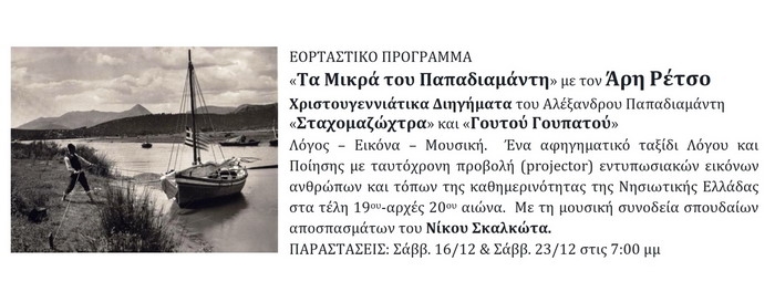 Ο Άρης Ρέτσος μάς ταξιδεύει στον μαγικό κόσμο του Παπαδιαμάντη Λόγος – Εικόνα – Μουσική. Ένα αφηγηματικό ταξίδι Λόγου και Ποίησης με ταυτόχρονη προβολή εικόνων και μουσική Σκαλκώτα. Σάββ. 16/12 & Σάββ. 23/12 στον Πολυχώρο Τέχνης «Αλεξάνδρεια» Ένας σπουδαίος ηθοποιός και σκηνοθέτης του ελληνικού θεάτρου, ο Άρης Ρέτσος, αφού μας αποκάλυψε τον ηχητικό πλούτο των Τραγωδιών του Αισχύλου και του Σοφοκλή στο Αρχαίο Δράμα, βάζει στο στόμα του τις […]