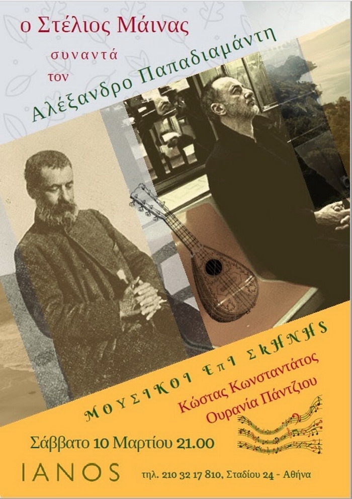 Κυριακή 11 Μαρτίου | 22.00 Τρεις μοναδικοί σολίστες, ο Περικλής Παπαπετρόπουλος στο πολίτικο λαούτο και στο τραγούδι, ο Χάρης Λαμπράκης στο νέι και ο Κυριάκος Γκουβέντας στο βιολί θα μας ταξιδέψουν στην ατμοσφαίρα της κωσταντινουπολίτικης ταβέρνας. Κέφι, μεράκι, τραγούδια του καφέ αμάν και της καθ ημάς Ανατολής, συνθέσεις ανωνύμων και επωνύμων δημιουργών θα γεμίσουν τη βραδιά. Ακόμη, θα ακουστούν συνθέσεις από τον τελευταίο δίσκο του Περικλή Παπαπετρόπουλου με τίτλο Μίκα. […]