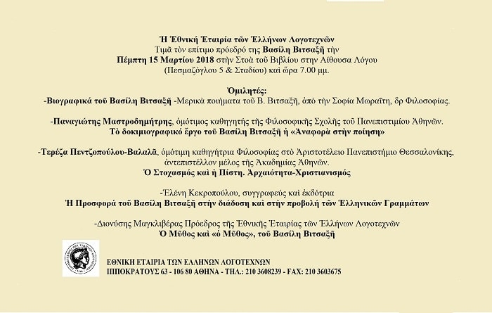 Στο πλαίσιο των εορτασμών για τον «Μήνα της ποίησης», η Ελληνοαμερικανική Ένωση και οι μηνιαίες ποιητικές συναντήσεις «Με τα λόγια (γίνεται)» παρουσιάζουν βραδιά αφιερωμένη στον σημαντικό Αμερικανό ποιητή Ezra Pound και στα συντομότερα ποιήματά του από τα Προσωπεία (Personae). Η εκδήλωση θα πραγματοποιηθεί την Δευτέρα 19 Μαρτίου 2018, στις 19:30, στο Θέατρο της Ελληνοαμερικανικής Ένωσης (Μασσαλίας 22, Κολωνάκι). Ο Ezra Pound (1885-1972) –ο «καλύτερος τεχνίτης» (il miglior fabbro) κατά την […]
