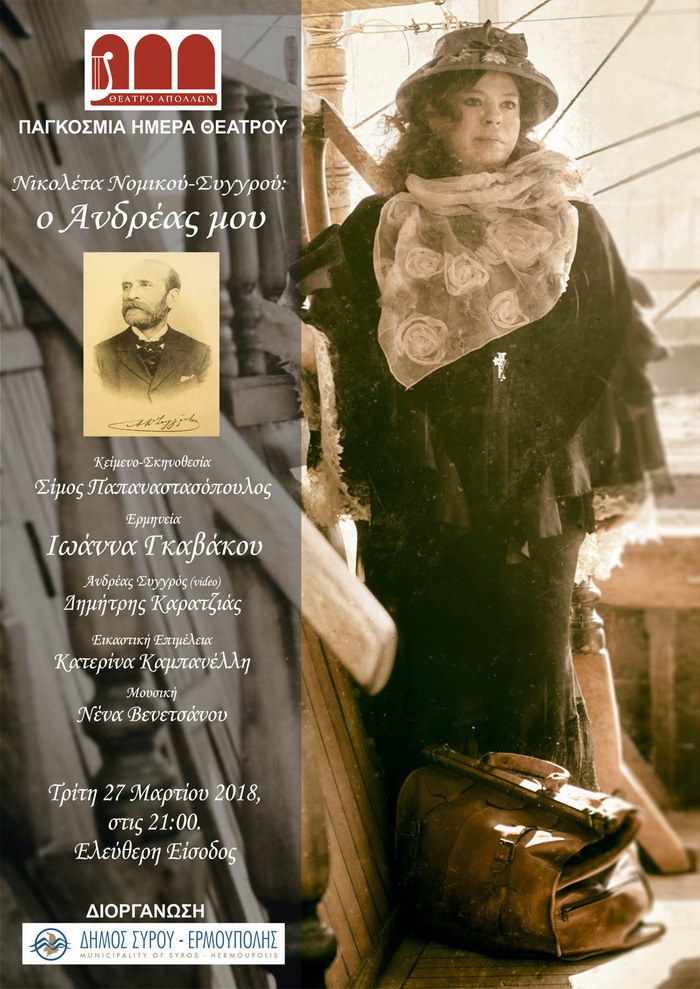 Παγκόσμια Ημέρα Θεάτρου Στο πλαίσιο της Παγκόσμιας Ημέρας Θεάτρου ο Δήμος Σύρου - Ερμούπολης διοργανώνει ξεναγήσεις σε μαθητές σχολείων της Πρωτοβάθμιας και Δευτεροβάθμιας Εκπαίδευσης στο Θέατρο Απόλλων και θεατρική παράσταση με Ελεύθερη Είσοδο για το κοινό. Ο Δήμος Σύρου - Ερμούπολης παρουσιάζει στο ιστορικό Θέατρο Απόλλων την μοναδική παράσταση «Νικολέτα Νομικού Συγγρού: Ο Ανδρέας μου» του ΣΙΜΟΥ ΠΑΠΑΝΑΣΤΑΣΟΠΟΥΛΟΥ Σκηνοθεσία:Σίμος Παπαναστασόπουλος Εικαστική Επιμέλεια:Κατερίνα ΚαμπανέλληΜουσική:Νένα Βενετσάνου Φωτισμοί:Άκης ΣαμοληςΠαραγωγή:VAULT Theatre Plus Ερμηνεία:Ιωάννα ΓκαβακουΔημήτρης Καρατζιάς (σε video […]
