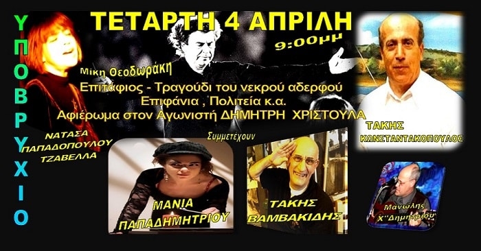 «Μια Ξεχωριστή Μέρα» ΘΕΑΤΡΟ ΑΛΜΑ(ΑΓΙΟΥ ΚΩΝΣΤΑΝΤΙΝΟΥ ΚΑΙ ΑΚΟΜΙΝΑΤΟΥ 15 – 17, ΤΗΛ. 210 5220100) Έξτρα παραστάσεις:Μεγάλη Δευτέρα,Μεγάλη Τρίτη καιΜεγάλη Τετάρτη ώρα 20:00με γενική είσοδο 10 ευρώ. ΜΙΑ ΞΕΧΩΡΙΣΤΗ ΜΕΡΑ, μια ξεχωριστή παραγωγή του Αλέξανδρου Ρήγα. Η πολυβραβευμένη ταινία ορόσημο «Μία Ξεχωριστή Μέρα» (Una Giornata Particolare) του Έττορε Σκόλα, ανεβαίνει σε θεατρική διασκευή του Αλέξανδρου Ρήγα και σκηνοθεσία της Άσπας Καλλιάνη και παρουσιάζεται από μία παραγωγή υψηλών προδιαγραφών στο θέατρο Άλμα. […]