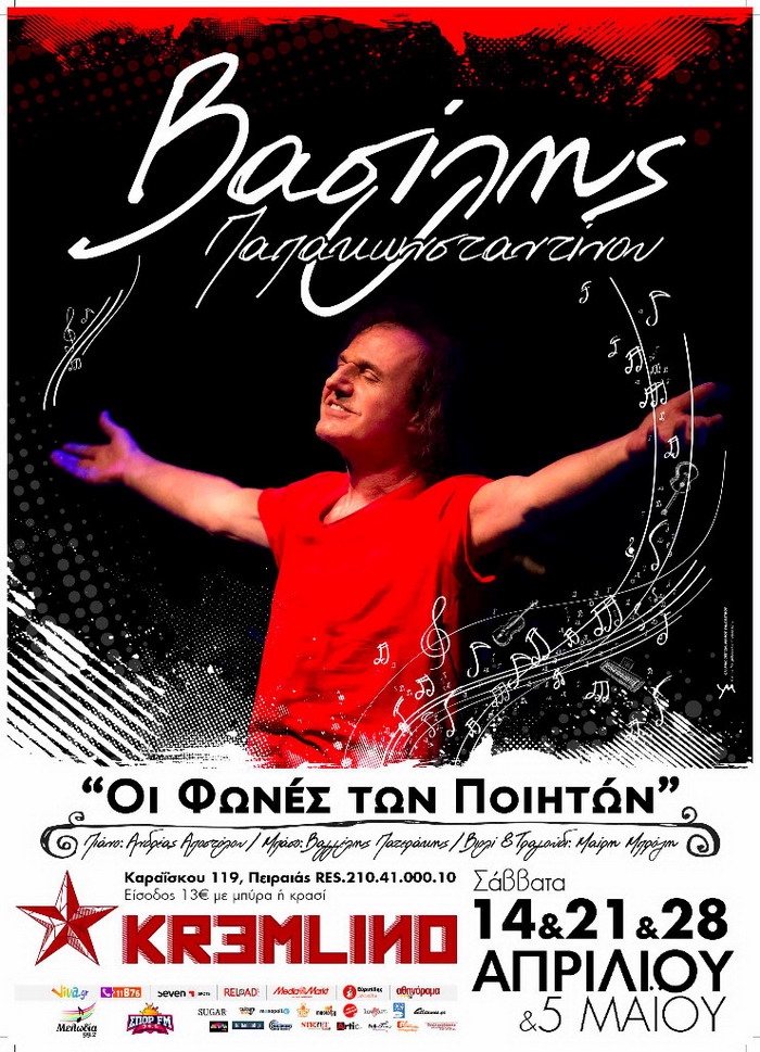 Ο Βασίλης Παπακωνσταντίνου ανεβαίνει στη σκηνή του Kremlino στον ΠειραιάΓια τέσσερα μόνο Σάββατα14 & 21 & 28 Απριλίου & 5 Μαΐου«Οι φωνές των ποιητών»Όταν θέλεις στ’ αλήθεια, να ακουστούν οι φωνές των ποιητών, μετατρέπεις την ηλεκτρική συνοδεία σε ακουστικά όργανα. Τον συνοδεύουν μόνο ένα πιάνο, ένα βιολί και ένα μπάσο. Γιατί αυτά που θέλει να ακουστούν, είναι το παράπονο του Τάσου Λειβαδίτη, τα λόγια του Κώστα Βάρναλη, η οικουμενικότητα του Οδυσσέα […]
