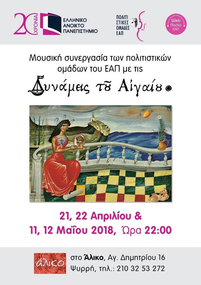 Σάββατο 21 και Κυριακή 22 Απριλίου | 22.00 Δυνάμεις Του Αιγαίου Οι Δυνάμεις Του Αιγαίου εμφανίζονται ως μουσική ομάδα για πρώτη φορά στις αρχές της δεκαετίας του '80, ηχογραφώντας παλιά ανώνυμα ελληνικά τραγούδια τα οποία παρουσίαζαν σε συναυλίες σε όλη την Ευρώπη. Αργότερα οι πέντε νέοι μουσικοί παρουσιάζουν και δικά τους τραγούδια που είναι εμπνευσμένα από την μουσική παράδοση του Αιγαίου, της ανατολικής Μεσογείου και των Βαλκανίων, διαμορφώνοντας ένα πρωτότυπο […]