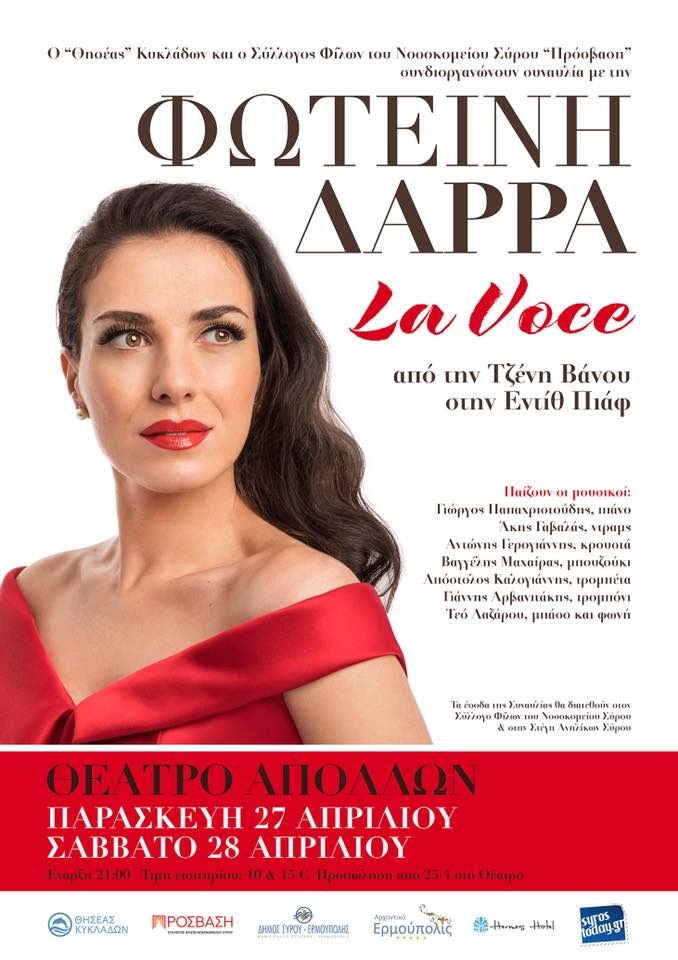 ΜΥΡΙΣΕ ΑΝΟΙΞΗ ! Όλα γεμίζουν φως! Η Φωτεινή Δάρρα μαζί με τους εκλεκτούς συνεργάτες της αναλαμβάνει να μας ταξιδέψει μελωδικά και φέτος με την καλοκαιρινή της περιοδεία που ξεκινάει από την μαγική Σύρο! Την Παρασκευή 27 και το Σάββατο 28 Απριλίου θα βρεθεί στο θέατρο «Απόλλων» για ένα ρεσιτάλ ερμηνείας!!! “La voce”(Φωνή) είναι ο τίτλος των παραστάσεων και η Φωτεινή ταξιδεύει κουβαλώντας στις αποσκευές της το πιο ζεστό ρούχο, τη […]