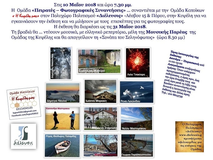 Πολυχώρος Πολιτισμού Διέλευσις Λέσβου 15 και Πόρου, 11256, Κυψέλη Τηλ.: 2108613739dieleusis@gmail.com www.dieleusis.gr fb: Πολυχώρος «διέλευσις» κοινότητα Την Πέμπτη 10 Μαΐου 2018 ετοιμάσαμε για τους Κυψελιώτες γείτονες μας άλλη μια ιδιαίτερη εκδήλωση. Συγκεκριμένα στις 7.30 μμ. στον Πολυχώρο Πολιτισμού «Διέλευσις» (Λέσβου 15 & Πόρου, Κυψέλη), γίνονται τα εγκαίνια έκθεσης φωτογραφίας από την Ομάδα «Πειρατές – Φωτογραφικές Συναντήσεις». Οι καλλιτέχνες θα μιλήσουν με το κοινό για τις φωτογραφίες τους. Η έκθεση θα […]