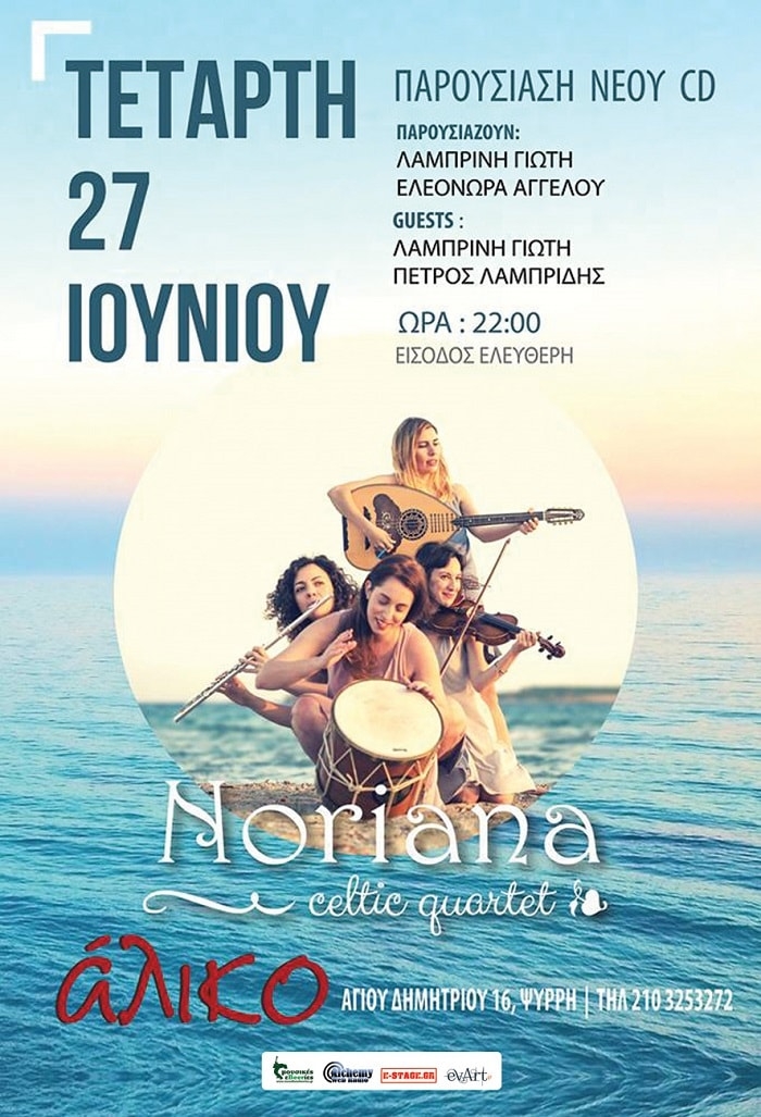 Τετάρτη 27 Ιουνίου | 22.00 Noriana Oι Noriana βρίσκονται στην ευχάριστη θέση να ανακοινώσουν την παρουσίαση του νέου τους άλμπουμ και σας προσκαλούν την Τετάρτη 27 Ιούνιου, ώρα 22.00 στο αγαπημένο Άλικο, στο κέντρο της Αθήνας. Τις Noriana θα παρουσιάσουν:η Λαμπρινή Γιώτη, εθνομουσικολόγος με ειδίκευση στο Ιρλανδικό Γαέλικο (Κέλτικο) τραγούδι α καπέλα, συν-ιδρυτικό μέλος Sòlastas, ιδρυτικό μέλος-μαέστρος κέλτικης χορωδίας Curfá Gaelic/Nordic Choir Athens Greece, που έχει συμβάλει στη διάδοση του […]