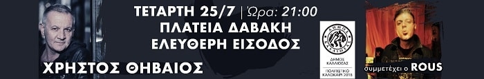 ΧΡΗΣΤΟΣ ΘΗΒΑΙΟΣΣυμμετέχει ο ROUS Τετάρτη 25 Ιουλίου, Ώρα: 21.00Πλατεία Δαβάκη, ΚαλλιθέαΕίσοδος Ελεύθερη Από τις «Μέρες Αδέσποτες» στο «Σιδερένιο Νησί». 22 χρόνια δισκογραφίας και ο Χρήστος Θηβαίος, συγκεντρώνει τις καλύτερες στιγμές του, και παρουσιάζει ένα πρόγραμμα γεμάτο συναίσθημα, μελωδία και σπουδαίες επιτυχίες. Τραγουδοποιός σπάνιας ευαισθησίας και ερμηνευτής υψηλών επιδόσεων, ο Χρήστος Θηβαίος διαλέγει τα αγαπημένα του τραγούδια από την πορεία του στη μουσική (όπως: «Ημερολόγιο», «Περικοπές Ενός Απόκρυφου Ευαγγελίου», “Μέρες Αδέσποτες», […]