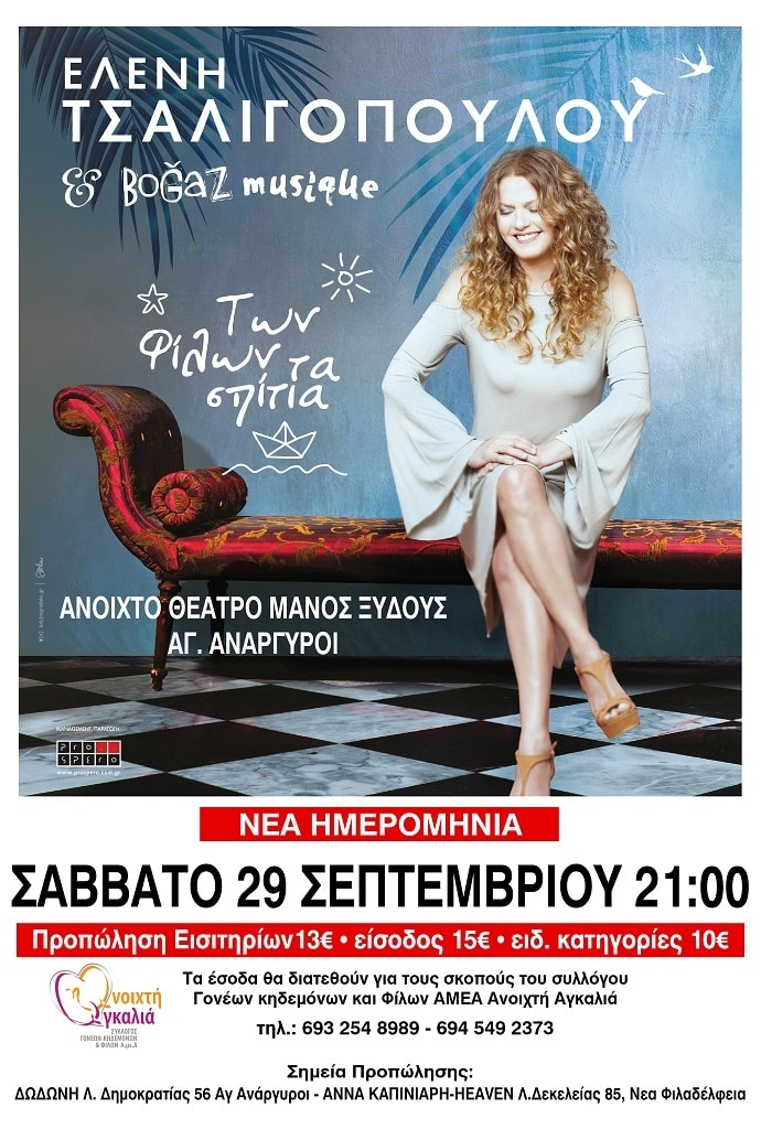 ΕΛΕΝΗ ΤΣΑΛΙΓΟΠΟΥΛΟΥ & Bogaz Musique “ Των φίλων τα σπίτια ” ΣΑΒΒΑΤΟ 29 ΣΕΠΤΕΜΒΡΙΟΥ: ΑΓΙΟΙ ΑΝΑΡΓΥΡΟΙΑΝΟΙΧΤΟ ΘΕΑΤΡΟ ΜΑΝΟΣ ΞΥΔΟΥΣ Το Σάββατο 29 Σεπτεμβρίου θα πραγματοποιηθεί η εξ αναβολής συναυλία της Ελένης Τσαλιγοπούλου και των Bogaz Musique στο Ανοιχτό Θέατρο Μάνος Ξυδούς, στους Αγίους Αναργύρους Αττικής. Τα έσοδα της συναυλίας θα διατεθούν για τους σκοπούς του Συλλόγου Γονέων, Κηδεμόνων & Φίλων ΑΜΕΑ «Ανοιχτή Αγκαλιά» «Των φίλων τα σπίτια» είναι ο τίτλος […]