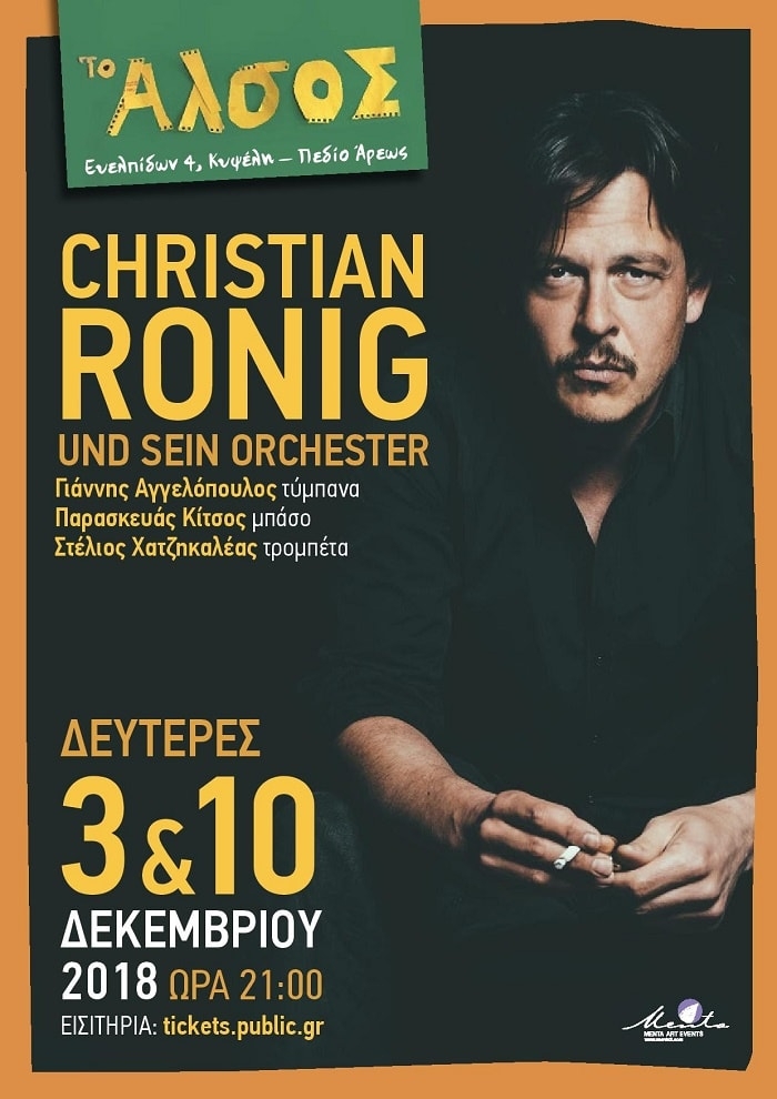 «JOUR FIXE»Christian Ronig UND SEIN ORCHESTER Ένα πολύ ξεχωριστό πρόγραμμα έχει ετοιμάσει για Το Άλσος ο Christian Ronig, ο Γερμανός μουσικός που μαγεύτηκε από τη λαϊκή και ρεμπέτικη ελληνική μουσική και της άνοιξε μια πόρτα που οδηγεί σε νέους δρόμους. Ρεμπέτικα, λαϊκά, αλλά και πιο σύγχρονα ελληνικά τραγούδια, φωτίζονται αλλιώς από τον Christian Ronig, που μέσα από το album του “Greece is mine”, αποκαλύπτει ένα εντελώς διαφορετικό πρόσωπο για τραγούδια ορόσημα. Ο ήχος τους ήταν αποκάλυψη […]