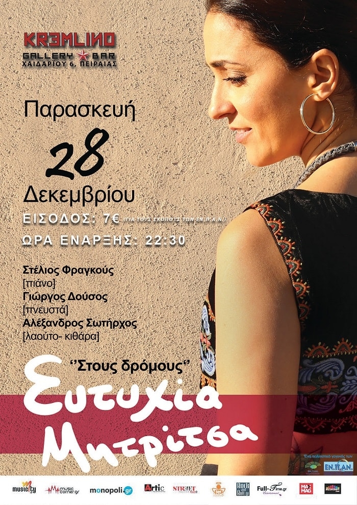 Παρασκευή 28 Δεκεμβρίου ΕΥΤΥΧΙΑ ΜΗΤΡΙΤΣΑ "ΣΤΟΥΣ ΔΡΟΜΟΥΣ"ΕΥΤΥΧΙΑ ΜΗΤΡΙΤΣΑ ΣΤΟΥΣ ΔΡΟΜΟΥΣ KREMLINO GALLERY BAR, 28 ΔΕΚΕΜΒΡΙΟΥ 2018 Η Ευτυχία Μητρίτσα βγαίνει στους δρόμους και ξεκινά τις βόλτες της. Εκεί έξω, που όλα συμβαίνουν, τα γλέντια μπλέκονται με τις ρομαντικές εξομολογήσεις, οι παρέες με τις μοναχικές φιγούρες, το αστικό τοπίο με τις μνήμες καταγωγής μας. Την Παρασκευή 28 Δεκεμβρίου υποδέχεται τους φίλους της στην μουσική σκηνή Kremlino Gallery Bar στον Πειραιά, παρέα […]