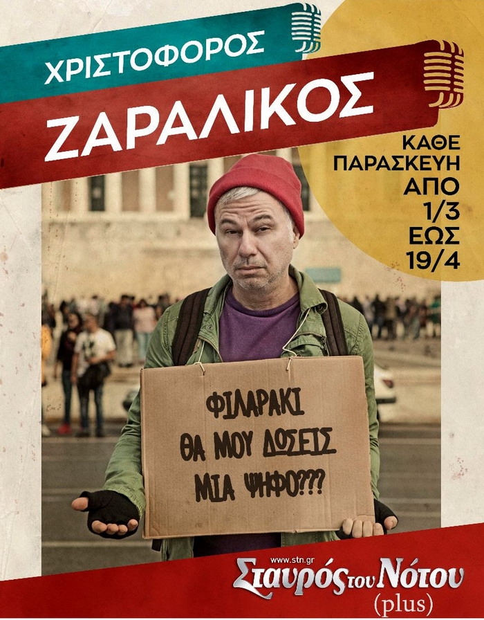 Χριστόφορος Ζαραλίκος“Φιλαράκι θα μου δώσεις μια ψήφο”Σταυρός του Νότου PlusΚάθε Παρασκευή από 1 Μαρτίου Ο «όρθιος κωμικός» Χριστόφορος Ζαραλίκος επιστρέφει στην αγαπημένη του μουσική σκηνή Σταυρος του Νότου Plus με την προεκλογική stand up comedy παράσταση “Φιλαράκι θα μου δώσεις μια ψήφο” και μας υπόσχεται εγγυημένο κέφι κάθε Παρασκευή από 1 Μαρτίου! Ο αστείρευτος Χριστόφορος Ζαραλίκος, καυστικός και απρόβλεπτος όπως πάντα, στην προκλητική νέα του παράσταση βάζει στο στόχαστρο τα […]