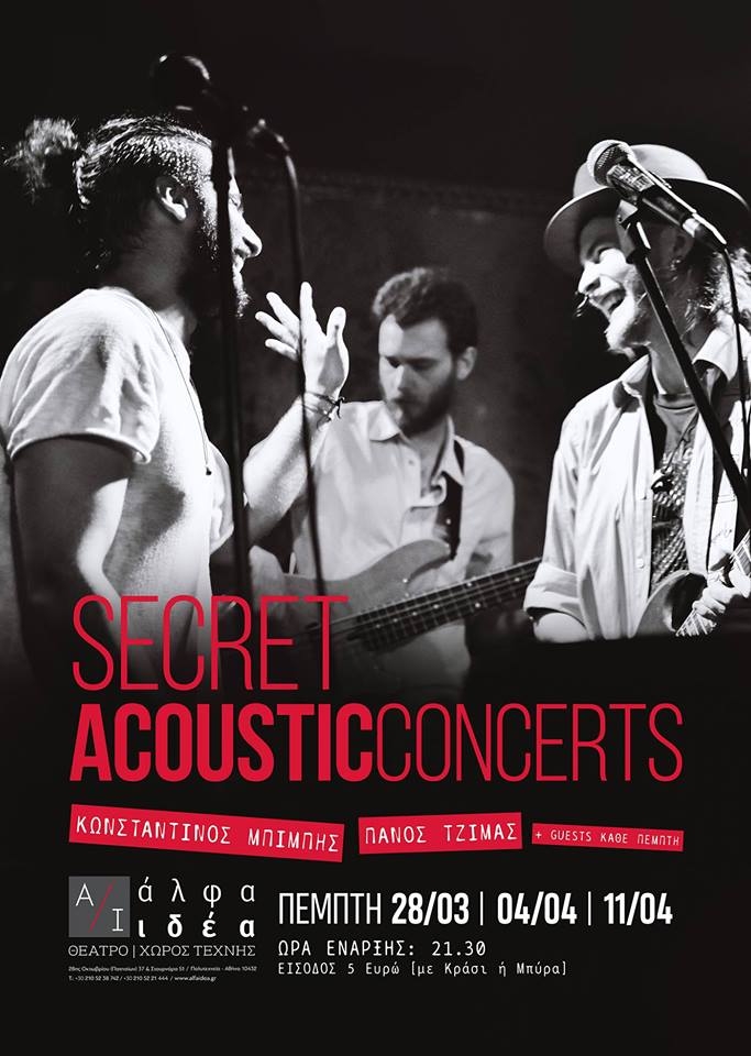 SECRET ACOUSTIC CONCERTS ΠΕΜΠΤΗ 28 ΜΑΡΤΙΟΥ ΣΤΙΣ 21:30 ΠΕΜΠΤΗ 04 ΑΠΡΙΛΙΟΥ ΣΤΙΣ 21:30 ΠΕΜΠΤΗ 11 ΑΠΡΙΛΙΟΥ ΣΤΙΣ 21:30 Ο Κωνσταντίνος Μπιμπής συναντάει τον Πάνο Τζίμα σε ένα μουσικό ακουστικό ταξίδι στο φουαγιέ του Άλφα.Ιδέα, που για 3 Πέμπτες μετατρέπεται σε μια υπέροχη μουσική σκηνή για να ακουστούν τραγούδια αγαπημένα, τραγούδια ξεχασμένα, τραγούδια από τα περασμένα. Ο Κωνσταντίνος Μπιμπής και ο Πάνος Τζίμας που είναι και οι δυο μέλη της νέας […]