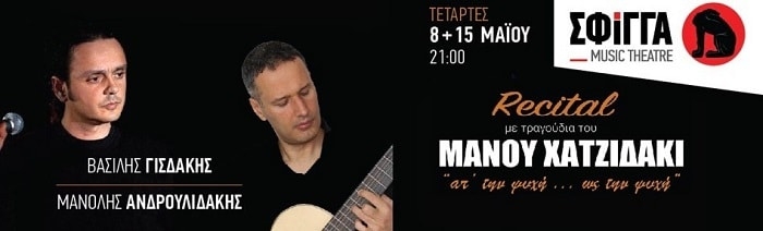Ο Βασίλης Γισδάκης και ο Μανόλης Ανδρουλιδάκης στη μουσική σκηνή Σφίγγα «απ' την ψυχή… ως την ψυχή...» Ένα recital με τραγούδια του Μάνου Χατζιδάκι Τετάρτη 8 και 15 Μαΐου Ο ερμηνευτής Βασίλης Γισδάκης, και ο σολίστας κιθαρίστας και συνθέτης Μανόλης Ανδρουλιδάκης συναντιούνται στη σκηνή της Σφίγγας τις Τετάρτες 8 και 15 Μαΐου και μας παρουσιάζουν ένα ρεσιτάλ με τραγούδια του Μάνου Χατζιδάκι με τίτλο «Απ’ την ψυχή… ως την ψυχή…». Δυο σημαντικοί καλλιτέχνες της σύγχρονης γενιάς, ο καθένας με […]