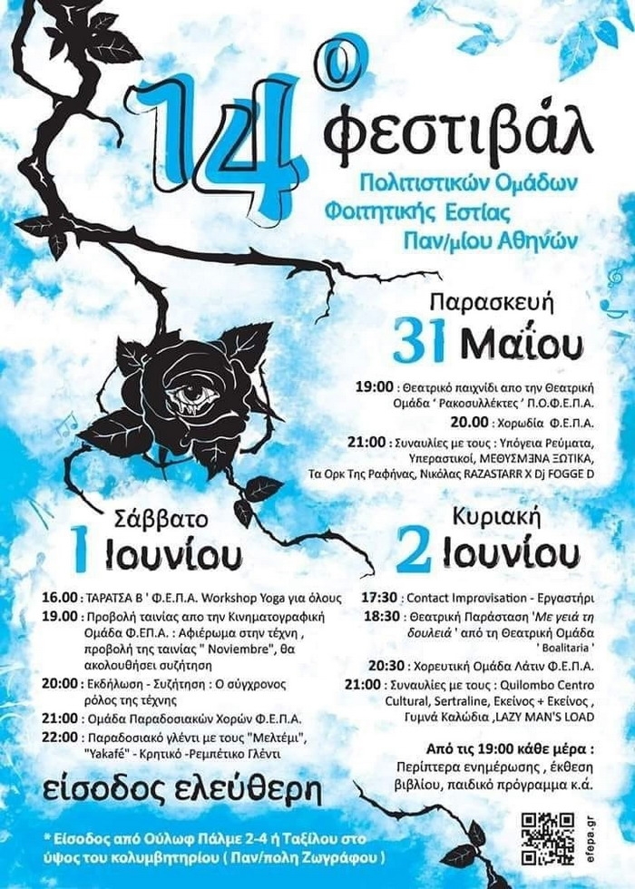 Είμαστε οι Πολιτιστικές Ομάδες της Φοιτητικής Εστίας του Πανεπιστημίου Αθηνών (Π.Ο.Φ.Ε.Π.Α.) και διοργανώνουμε και φέτος, όπως κάθε χρόνο, το 13o φεστιβάλ μας το οποίο θα πραγματοποιηθεί στις 31 Μαΐου και 1 με 2 Ιουνίου στο χώρο των Εστιών, στην Πανεπιστημιούπολη Αθηνών. Το φεστιβάλ στήνεται κάθε χρόνο από τις ίδιες τις πολιτιστικές ομάδες της Εστίας (θεατρική ομάδα, χορευτικά τμήματα: λάτιν, σύγχρονο και παραδοσιακών χορών, χορωδία, κινηματογραφική ομάδα, ομάδα μουσικών, yoga). Οι […]