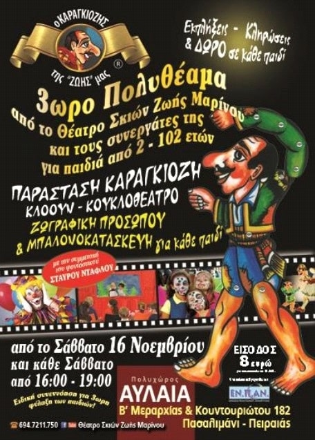 ΘΕΑΤΡΟY ΣΚΙΩΝ ΖΩΗΣ ΜΑΡΙΝΟΥ Η μοναδική καραγκιοζοπαίχτρια και συγγραφέας Ζωή Μαρίνου σε διαδραστικές παραστάσεις «Καραγκιόζη» ψυχαγωγεί με τα έργα της μικρούς και μεγάλους με τεράστια επιτυχία σε όλη τη Ελλάδα. Το Σάββατο 30 Νοεμβρίου από τις 16:00 έως 19:00 στον πολυχώρο «ΑΥΛΑΙΑ», Κουντουριώτου 182 και 2ας Μεραρχίας στον Πειραιά παρουσιάζεται ένα μοναδικό πολυθέαμα με παράσταση Καραγκιόζη, διαδραστικά παιχνίδια με εμψυχωτές, κλόουν, μπαλονοκατασκεύες, ζωγραφική προσώπου κι άλλες εκπλήξεις και κλήρωση δώρων. […]