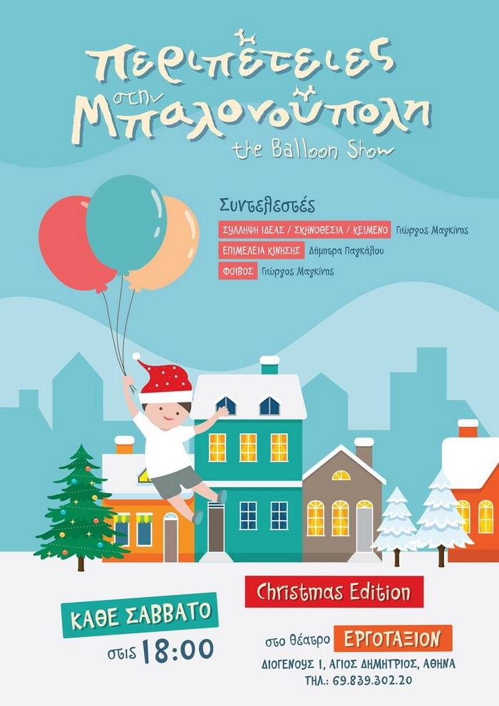 Σάββατο 14, 21 & 28/12 στις 18:00. Ο Φοίβος, ένα έξυπνο και ντροπαλό παιδί μέσω των ονείρων του ξυπνάει στην μυστική κρύπτη της Μπαλονούπολης. Μέσα από μυθικές μπαλονο-δοκιμασίες μεταμορφώνεται στον πιο τρανό μπαλονοποιό και με μοναδικό "όπλο" τα πολύχρωμα μπαλόνια του, δημιουργεί διαδραστικές ιστορίες και σώζει την Μπαλονούπολη Ένα θεαματικό χριστουγεννιάτικο Balloon show με μπαλονοκατασκευές στο πνεύμα των χριστουγέννων με χορό, τραγούδι, γέλιο και πολλές εκπλήξεις! Ελάτε να τραγουδήσουμε και […]