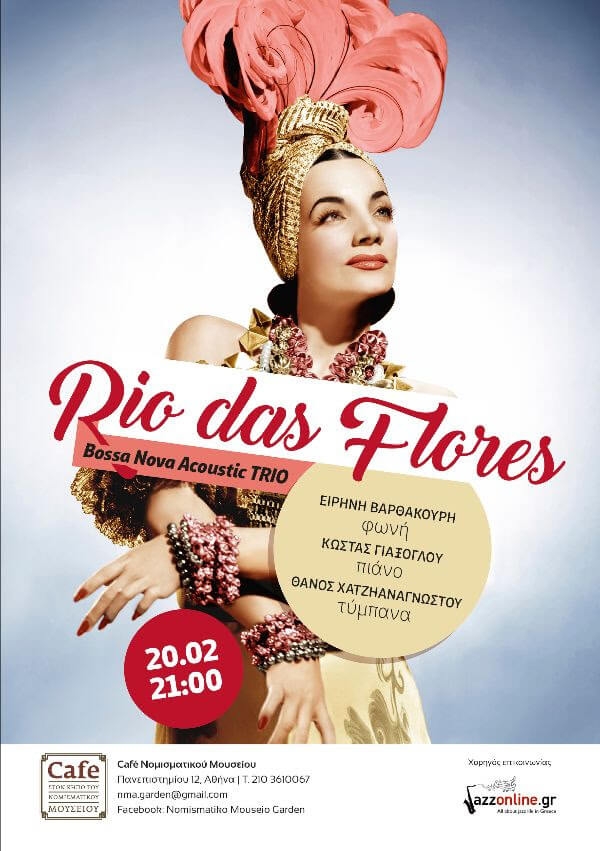 Rio de las FloresBossa Nova Acoustic TRIOΣτο café του Νομισματικού Μουσείουτην Πέμπτη 20 Φεβρουαρίου 2020Στις 9 μ.μ. Ένα μουσικό project που ξεκινάει με την αισθαντική bossa nova των '60s, συναντά την εκρηκτική samba του Rio de Janeiro, φλερτάρει με τα βραζιλιάνικα funky grooves των '70s για να καταλήξει στην ελληνική σκηνή της ίδιας retro εποχής και διάθεσης, διασκευάζοντας την σε bossa nova. Σε αυτήν τη μουσική διαδρομή δημιουργείται ένα ταξίδι […]