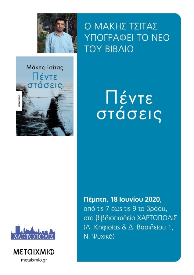 Το βιβλιοπωλείο ΧΑΡΤΟΠΟΛΙΣ και οι εκδόσεις ΜΕΤΑΙΧΜΙΟ σας προσκαλούν να γνωρίσετε από κοντά τον συγγραφέα Μάκη Τσίτα την Πέμπτη, 18 Ιουνίου 2020, στο βιβλιοπωλείο ΧΑΡΤΟΠΟΛΙΣ (Λ. Κηφισίας & Δ. Βασιλείου 1, Ν. Ψυχικό). Ο Μάκης Τσίτας σας περιμένει από τις 7 έως τις 9 το βράδυ, για να συνομιλήσει μαζί σας και να σας υπογράψει το νέο του βιβλίο ΠΕΝΤΕ ΣΤΑΣΕΙΣ, έναν συνταρακτικό μονόλογο μιας γυναίκας για τα όνειρα και […]