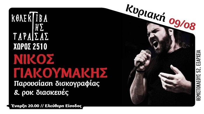 Νίκος Γιακουμάκης LIVEΠαρουσίαση δισκογραφίας & ροκ διασκευέςΚυριακή 09 Αυγούστουστην Κολεκτίβα της ταράτσας,Θεμιστοκλέους 52, Εξάρχειααπό τις 20:00-00:00Ελεύθερη Είσοδος *τηρούνται όλα τα μέτρα που θεωρούνται απαραίτητα ΒΙΟΓΡΑΦΙΚΟ ΣΗΜΕΙΩΜΑO Νίκος Γιακουμάκης (Tntsokin) είναι συνθέτης, στιχουργός και τραγουδιστής. Έχει σπουδάσει πιάνο και γνωρίζει κιθάρα και drums. Αποφοίτησε από το παιδαγωγικό δημοτικής εκπαίδευσης το 2005 και έκτοτε ασχολείται με τις 2 του αυτές αγάπες! Διδασκαλία και μουσική.Η πρώτη επαφή με την μουσική έγινε στην ηλικία […]