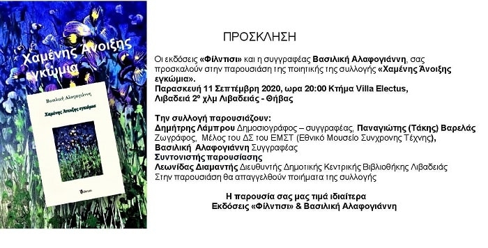 Χαμένης Άνοιξης εγκώμιατης Βασιλικής ΑλαφογιάννηISBN: 978-618-5456-02-3 Λιανική τιμή 12 ευρώ Κυκλοφόρησε η πρώτη ποιητική συλλογή της Βασιλικής Αλαφογιάννη, με 59 ποιήματα, τα περισσότερα από τα οποία γράφτηκαν τα τελευταία χρόνια.Το βιβλίο «Χαμένης άνοιξης εγκώμια» το δημιούργησε η μυστική ανάγκη της ψυχής μου να μεταβάλει την τρικυμία σε τραγούδι, μοιρολόι, ύμνο δοξαστικό.Γυρεύοντας να γεφυρώσω τους κόσμους ακροβατώντας ανάμεσα στους απρόσκλητους επισκέπτες τού νου που έρχονταν να καταργήσουν τον ύπνο μου τις […]