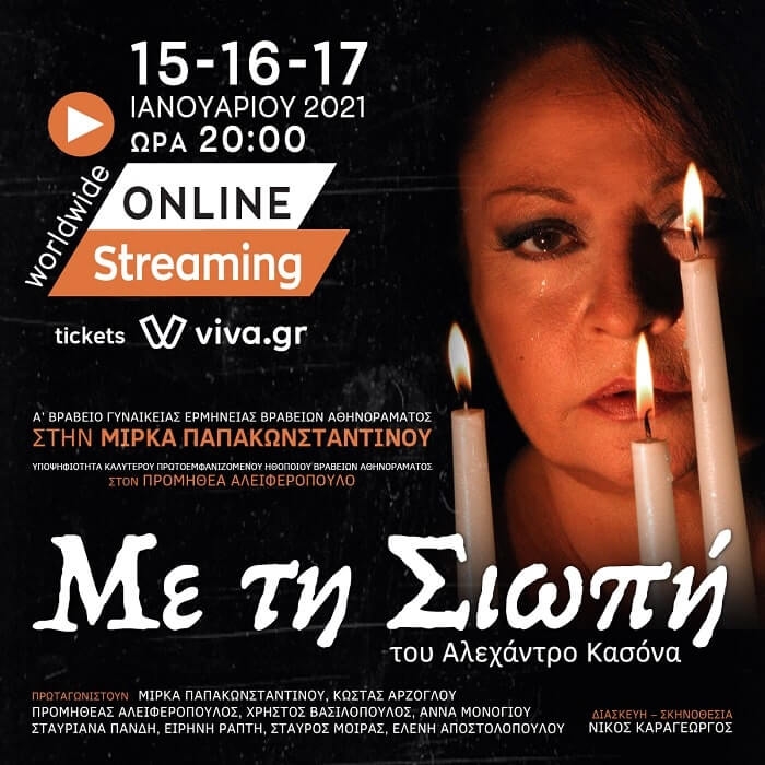 Οι θεατρικές επιχειρήσεις Λεμπέση θα παρουσιάσουν μέσω worldwide online streaming, την Παρασκεύη 15.1, το Σάββατο 16.1 και την Κυριακή 17.1 και ώρα 20.00, την βραβευμένη θεατρική παράσταση « Με τη Σιωπή » του Αλεχάντρο Κασόνα, που χάρισε στην Μίρκα Παπακωνσταντίνου το πρώτο Βραβείο γυναικείας ερμηνείας στα βραβεία Αθηνοράματος και στον Προμηθέα Αλειφερόπουλο την πρώτη του υποψηγιότητα ως Καλύτερου πρωτοεμφανιζόμενου ηθοποιού . Η παράσταση που ενθουσίασε το κοινό και υμνήθηκε από […]