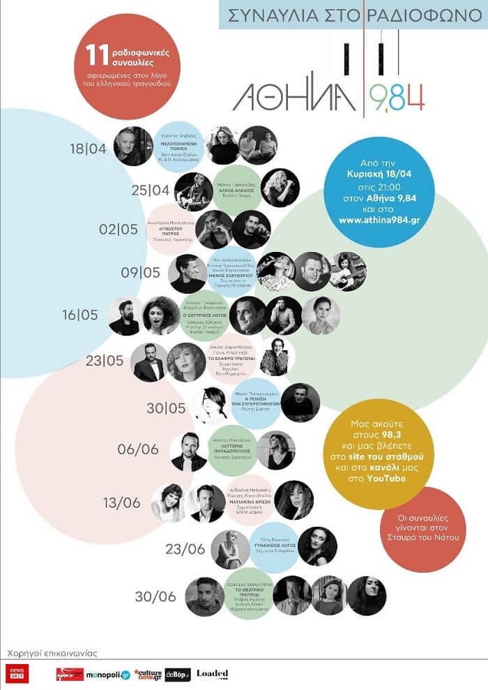 ΣΥΝΑΥΛΙΑ ΣΤΟ ΡΑΔΙΟΦΩΝΟ Κάθε Κυριακή από 18 Απριλίου έως 30 Ιουνίου Εν αρχή ήταν, είναι και θα είναι πάντα ο λόγος. Ο Αθήνα 98,4 εστιάζει στο λόγο του ελληνικού τραγουδιού και παρουσιάζει με ήχο και εικόνα 11 ραδιοφωνικές συναυλίες που δημιουργήθηκαν ειδικά γι’ αυτό το αφιέρωμα και δεν έχουν παρουσιαστεί ποτέ ξανά μέχρι σήμερα. 11 μουσικά γεγονότα, 11 βραδιές αφιερωμένες σε είδη του ελληνικού τραγουδιού αλλά και στιχουργούς που το χαρακτήρισαν. Από τη μία οι Θεματικές ενότητες: η […]