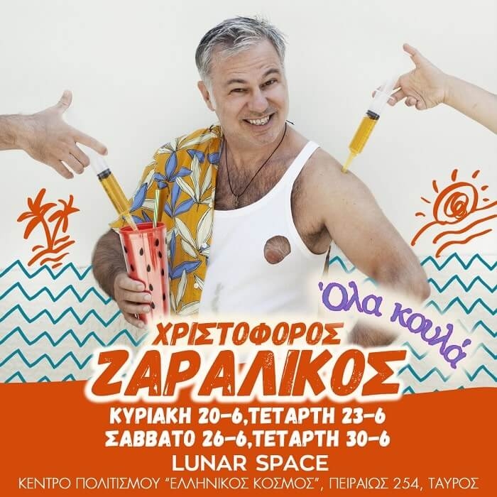 «ΟΛΑ ΚΟΥΛΑ»ΧΡΙΣΤΟΦΟΡΟΣ ΖΑΡΑΛΙΚΟΣ Πρεμιέρα Κυριακή 20 Ιουνίου Και για τις Τετάρτες 23 & 30 Ιουνίου Και επιπλέον παράσταση: Σάββατο 26 Ιουνίου @ LUNAR SPACE Μετά το χειμώνα έρχεται πάντα η άνοιξη και μετά την καραντίνα έρχεται ο τουρισμός, οπότε πάλι καλά ανοίξαμε και ο Χριστόφορος Ζαραλίκος βγαίνει ξανά στις σκηνές, ευέλικτος και εμβολιασμένος, να σατιρίσει τα τραγελαφικά που ζήσαμε τον τελευταίο χρόνο.Αμετανόητος και καυστικός μέχρι να του βάλουν τσιμέντο στα […]