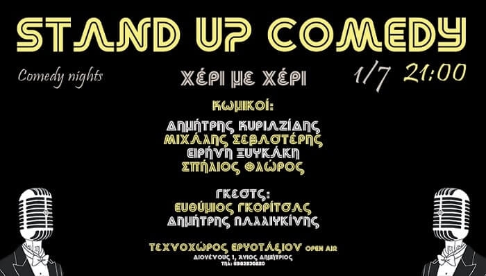 Stand Up Comedy "χέρι με χέρι" Σας έχει λείψει η κωμωδία; Και ειδικά η ζωντανή κωμωδία; Με ένα εξαιρετικό line up ο ένας κωμικός πασάρει το μικρόφωνο στον άλλο. Μια βραδιά με νέο υλικό και γέλιο. Επανερχόμαστε δυναμικά με φανταστικούς κωμικούς.Έξι εξαιρετικοί κωμικοί με αρκετές παραστάσεις στο ενεργητικό τους, συναντιούνται επί σκηνής για να μας προσφέρουν απλόχερα γέλιο.Η παράσταση θα λάβει χώρα στον εξωτερικό χώρο του Τεχνοχώρου Εργοτάξιον και θα […]