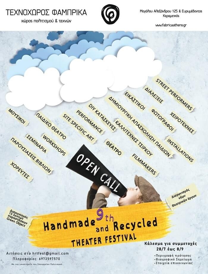 9th Handmade & Recycled Theater FestivalOpen CallΑνοιχτό κάλεσμα συμμετοχής στο πιο Χειροποίητο και Ανακυκλώσιμο Φεστιβάλ της Αθήνας.Από 15 Οκτωβρίου έως 23 Οκτωβρίου παίρνουμε την τέχνη στα χέρια μας! Η Πολυδραστική Ομάδα Τέχνης Fabrica Athens διοργανώνει φέτος το 9th Handmade & Recycled Theater Festival. Το αγαπημένο μας φεστιβάλ στη γειτονιά του Κεραμεικού επιστρέφει για ένατη συνεχόμενη χρονιά! Η Ιδέα Γιατί χειροποίητο και ανακυκλώσιμο; «Αυτό που με κόπο κάναμε, του δώσαμε έναν […]