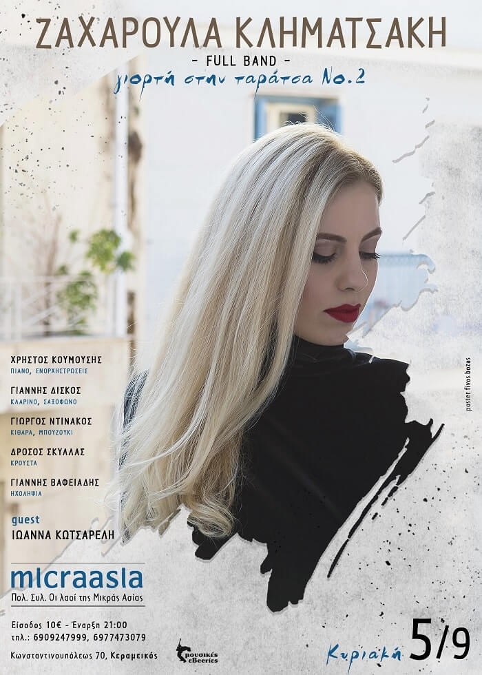 Η Ζαχαρούλα Κληματσάκη σας προσκαλεί τη μέρα της ονομαστικής της εορτής, για δεύτερη συνεχόμενη χρονιά, στην ταράτσα του «Micraasia-Fez» να γιορτάσετε παρέα. Μετά την κυκλοφορία του καινούριου της τραγουδιού «Μήπως έχεις φωτιά;» σε μουσική και στίχους του Σπύρου Γραμμένου, η Ζαχαρούλα αποχαιρετά το φετινό καλοκαίρι, στήνοντας μια γιορτή στην όμορφη ταράτσα του «Micraasia-Fez», ενώ ταυτόχρονα ετοιμάζεται πυρετωδώς για τις χειμερινές της εμφανίσεις. Παρέα με τους ταλαντούχους και καταξιωμένους μουσικούς της υπόσχονται να μας χαρίσουν μια αξέχαστη βραδιά με […]