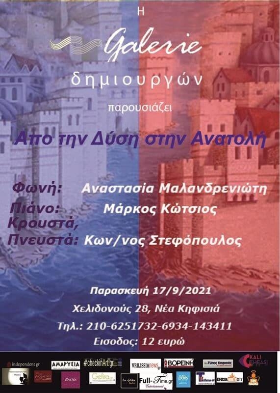 ΑΠΟ ΤΗ ΔΥΣΗ ΣΤΗΝ ΑΝΑΤΟΛΗΜουσική βραδιά με χρώματα και αρώματα Δύσης και Ανατολής. Την Παρασκευή 17 Σεπτεμβρίου στις 21:00 στον Πολυχώρο τέχνης Galerie Δημιουργών, η Αναστασία Μαλανδρενιώτη με την υπέροχη φωνή της και τη θεατρική της ερμηνεία θα μας ταξιδέψει μουσικά. Μαζί της οι μουσικοί: Μάρκος Κώτσιας στο πιάνο και Κωνσταντίνος Στεφόπουλος στα πνευστά και τα κρουστά.Τηρώντας με απόλυτο σεβασμό τις οδηγίες που διέπουν τους χώρους συνάθροισης και ιδιαίτερα τους […]