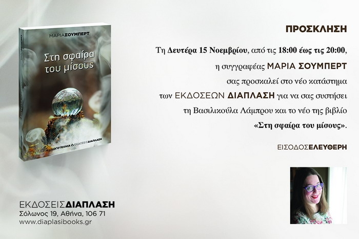 Οι Εκδόσεις Διάπλαση σας προσκαλούν τη Δευτέρα 15 Νοεμβρίουαπό τις 18:00 έως τις 20:00στο νέο κατάστημα των Εκδόσεων Διάπλασηγια να σας παρουσιάσουν την καινούργια συγγραφική δουλειάτης Μαρία Σούμπερτ «Στη σφαίρα του μίσους» και να σας συστήσουν την ηρωίδα του βιβλίου Βασιλικούλα Λάμπρου Ένα ψυχολογικό θρίλερ που η ιστορία του ξεκινάει στην Αθήνα του 70’ και φτάνει ως το σήμερα. Ένα κοινωνικό μυθιστόρημα που το μίσος αποκτάει δύναμη, ως εργαλείο εκδίκησης, αλλά παράλληλα […]