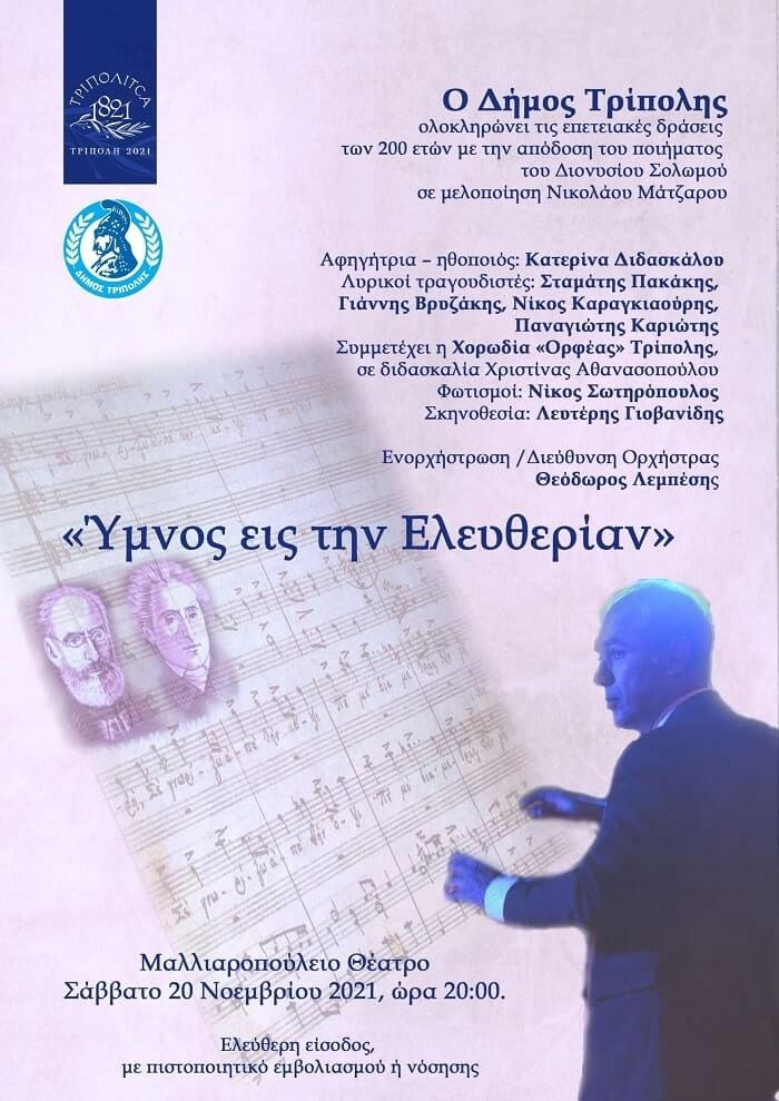 Το Σάββατο, 20 Νοεμβρίου 2021, στο Μαλλιαροπούλειο θέατρο, στις 8:00μ.μ., ο Δήμος Τρίπολης, στο πλαίσιο των εκδηλώσεών του, για τον εορτασμό των 200 χρόνων, από την επανάσταση του 1821, θα παρουσιάσει τον “ Ύμνο εις την Ελευθερία” του Διονυσίου Σολωμού, μελοποιημένο από τον Νικολάο Μάντζαρο, με τη συμμετοχή των λυρικών τραγουδιστών, Σταμάτη Πακάκη, Γιάννη Βρυζάκη, Νίκου Καραγκιαούρη, Παναγιώτη Καριώτη και τη χορωδία «Ορφέας» Τρίπολης, σε μουσική διδασκαλία Χριστίνας Αθανασοπούλου. Η […]