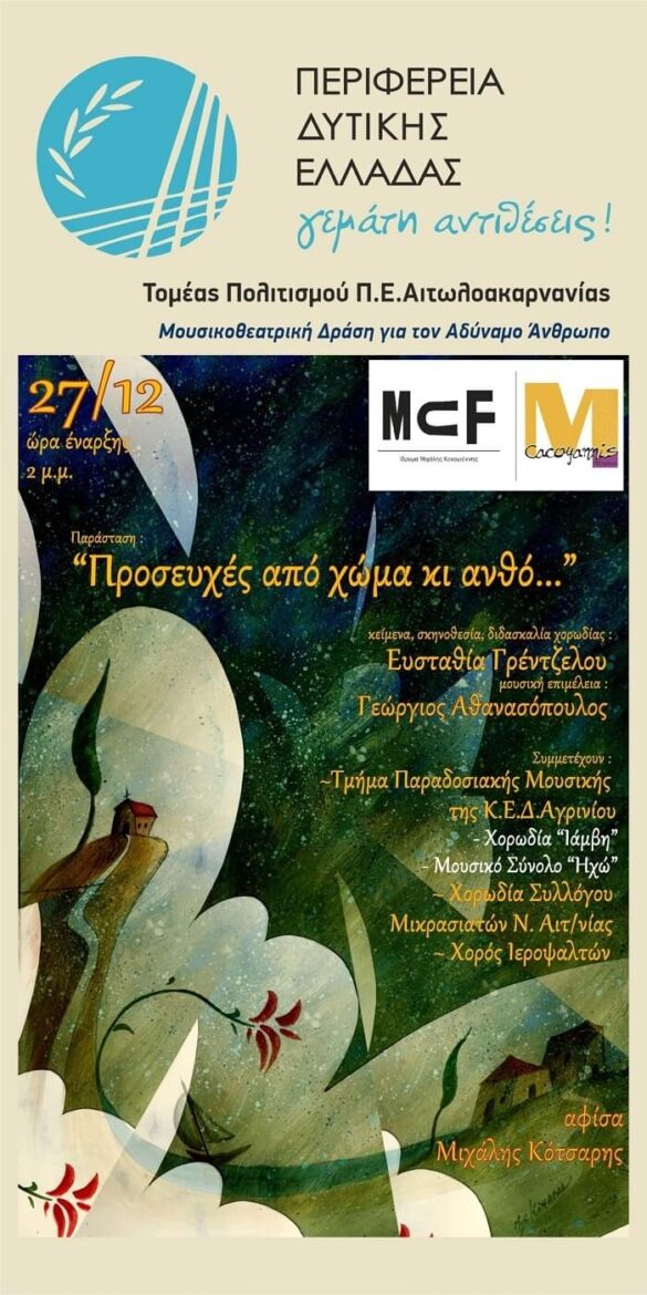 www.mcf.gr Συναυλία Βυζαντινών Ύμνων «προσευχές από χώμα κι ανθό…» Διοργάνωση: ΠΔΕ- ΠΕ ΑιτωλοακαρνανίαςΣυμμετέχουν:το Τμήμα Παραδοσιακής Μουσικής της Κ.Ε.Δ. ΑγρινίουΜουσικό Σύνολο «Ηχώ» (υπ. Γεώργιος Αθανασόπουλος)Χορωδία «Ιάμβη» & Χορωδία Συλλόγου Μικρασιατών Ν. Αιτωλοακαρνανίας (υπ. Ευσταθία Γρέντζελου)Χορός Ιεροψαλτών (υπ. Γεώργιος Λιούλιος) Ίδρυμα Μιχάλης ΚακογιάννηςΘΕΑΤΡΟ Είσοδος Ελεύθερη 27 Δεκεμβρίου 2021Στις 14.00 Η Περιφέρειας Δυτικής Ελλάδας – στο πλαίσιο των πολιτιστικών εκδηλώσεων και της εγκαθίδρυσης νέων συνεργασιών με φορείς Τέχνης, διοργανώνει σε συνεργασία με το […]