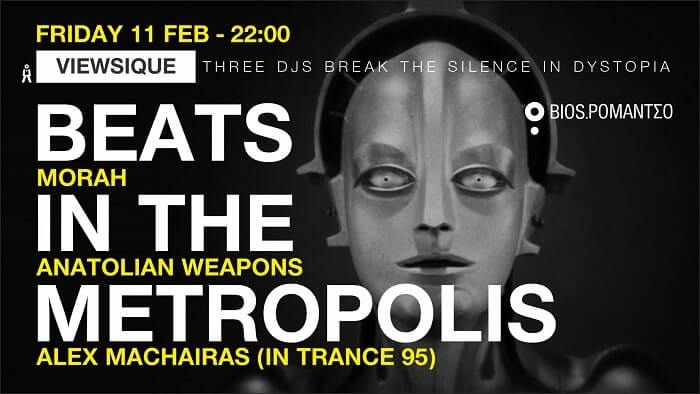 Viewsique: BEATS IN THE METROPOLIS ΠΡΟΒΟΛΗ | DJ set ΡΟΜΑΝΤΣΟ, Αναξαγόρα 3-5, Αθήνα Ημερομηνία: Παρασκευή 11 Φεβρουαρίου, 2022 Ώρα: 22:00 Είσοδος: Δωρεάν THREE DJs BREAK THE SILENCE IN DYSTOPIA Morah, Anatolian Weapons & Alex Machairas play over Fritz Lang's prophecy. MORAH https://soundcloud.com/morah-l ANATOLIAN WEAPONS https://soundcloud.com/anatolianweapons ALEX MACHAIRAS (in trance 95) https://minimalwave.com/artists/artist/in-trance-95/ Metropolis (1927) Σκην.: Fritz Lang Διάρκεια: 2 ώρες 33' Στη φουτουριστική Μητρόπολη, η κοινωνία είναι χωρισμένη ανάμεσα στην εύπορη […]