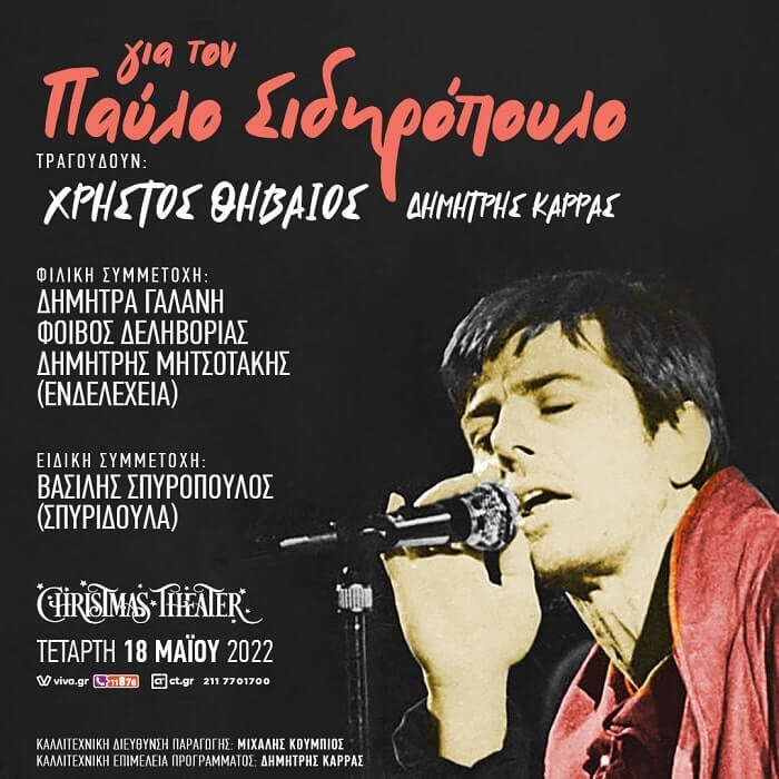 Για τον Παύλο Σιδηρόπουλο…Χρήστος Θηβαίος, Δημήτρης Καρράς Φιλική συμμετοχή:Δήμητρα Γαλάνη, Φοίβος Δεληβοριάς, Δημήτρης Μητσοτάκης ( ΕΝΔΕΛΕΧΕΙΑ) Ειδική συμμετοχή:Βασίλης Σπυρόπουλος (ΣΠΥΡΙΔΟΥΛΑ) ΤΕΤΑΡΤΗ 18 ΜΑΙΟΥ 2022Christmas Theater Καλλιτεχνική διεύθυνση παραγωγής: Μιχάλης ΚουμπιόςΚαλλιτεχνική επιμέλεια προγράμματος: Δημήτρης Καρράς Ένα μουσικό αφιέρωμα στον «πρίγκιπα» του ελληνικού ροκ που έφυγε νωρίς , σε ηλικία 42 ετών, στις 6 Δεκεμβρίου 1990. Οι σημερινοί δεκαεξάρηδες τον ανακαλύπτουν και πάλι, πιάνουν την κιθάρα να τραγουδήσουν τα τραγούδια του και […]
