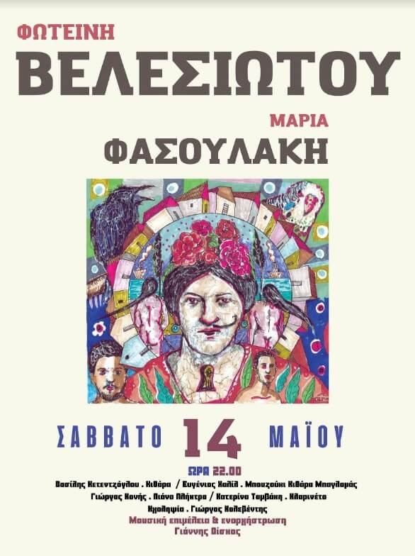 Η Φωτεινή Βελεσιώτου με τη νέα της δισκογραφική δουλειά στις αποσκευές και μια πλήρως ανανεωμένη μπάντα, θα παρουσιάσει ένα πρόγραμμα φρέσκο, με πολλές εκπλήξεις, που μας ταξιδεύει στη δισκογραφία της (Μέλισσες, διόδια κ.α.), στο παλιό καλό λαϊκό και ρεμπέτικο τραγούδι, από Καλδάρα, Ζαμπέτα, Τσιτσάνη και Άκη Πάνου έως Θεοδωράκη, Χατζιδάκι, Ξαρχάκο, Λοΐζο, Άσιμο και Σαββόπουλο. Ωστόσο, δεν λείπουν και τραγούδια νεότερων δημιουργών όπως του Σωκράτη Μάλαμα και του Θανάση Παπακωνσταντίνου […]