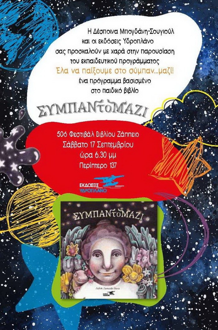 Η Δέσποινα Μπογδάνη-Σουγιούλ στην 50η Έκθεση Βιβλίου στο Ζάππειο για μια πρωτότυπη εκδήλωση!Η Δέσποινα Μπογδάνη-Σουγιούλ και οι Εκδόσεις Υδροπλάνο σας προσκαλούν, το Σάββατο 17 Σεπτεμβρίου στις 18:00, στην παρουσίαση του εκπαιδευτικού προγράμματος «Έλα να παίξουμε στο σύμπαν… μαζί!», που είναι βασισμένο στο παιδικό βιβλίο «ΣΥΜΠΑΝΤΟΜΑΖΙ». Ένα σκανταλιάρικο κόκκινο σκαθάρι, ένα μικρό κορίτσι που κάνει συνεχώς ερωτήσεις για τον κόσμο που το περιβάλλει, μια πιτσιλιά που έπεσε από τον νυχτερινό ουρανό και πλημμύρισε τα πάντα συναντιούνται και […]