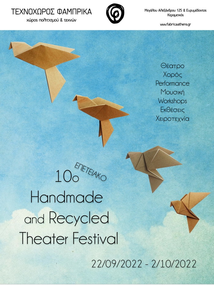 10th Handmade & Recycled Theater Festival 28 Σεπτεμβρίου – 2 Οκτωβρίου 2022 Τεχνοχώρος Φάμπρικα Μεγ. Αλεξάνδρου 125 & Ευρυμέδοντος - Κεραμεικός, Αθήνα Το Φεστιβάλ Χειροποίητου και Ανακυκλώσιμου Θεάτρου της Fabrica Athens (Handmade & Recycled Theater Festival – HRTFest) γιορτάζει τα 10 του χρόνια και επιστρέφει στον Κεραμεικό πιο δυναμικά από ποτέ! Το πρόγραμμα του 10ου HRTFest περιλαμβάνει φέτος συνολικά 61 δράσεις, με 26 παραστάσεις θεάτρου και performance, 10 εκπαιδευτικά σεμινάρια, 5 μουσικές δράσεις […]