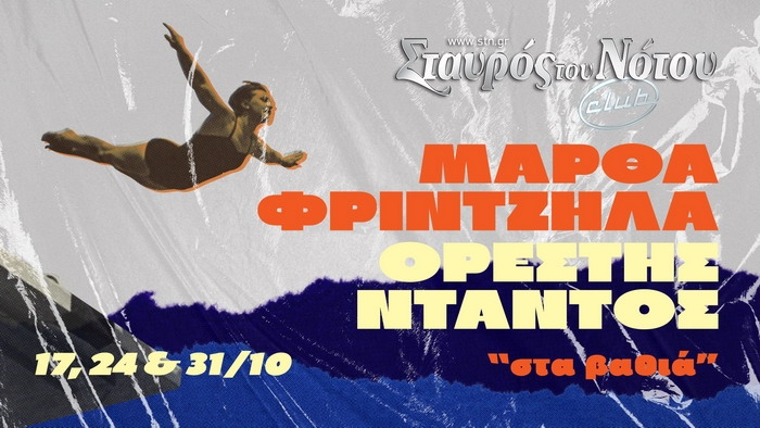 Η Μάρθα Φριντζήλα και ο Ορέστης Ντάντος, με αφορμή την εξαιρετικά επιτυχημένη συνεργασία τους στο τραγούδι «Νερό Στη Βάρκα», αποφάσισαν να ενώσουν τις μουσικές δυνάμεις τους και επί σκηνής. Για τρεις Δευτέρες του Οκτώβρη (17, 24 και 31/10), θα βουτάνε «Στα Bαθιά» στο Club του Σταυρού του Νότου σε μια μοναδική μουσική παράσταση. Οι ίδιοι σημειώνουν: Η Μάρθα κι ο Ορέστης δεν γνωρίζονταν πριν να μπει νερό στη βάρκα τους. Η Μάρθα κι ο Ορέστης […]